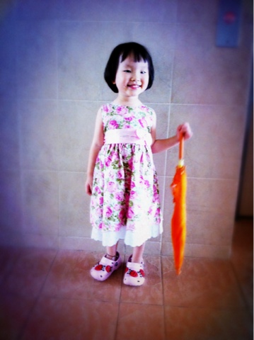 Thanks to 姨姨,here is her loving the pair of ladybug shoes and with her favie umbrella...
